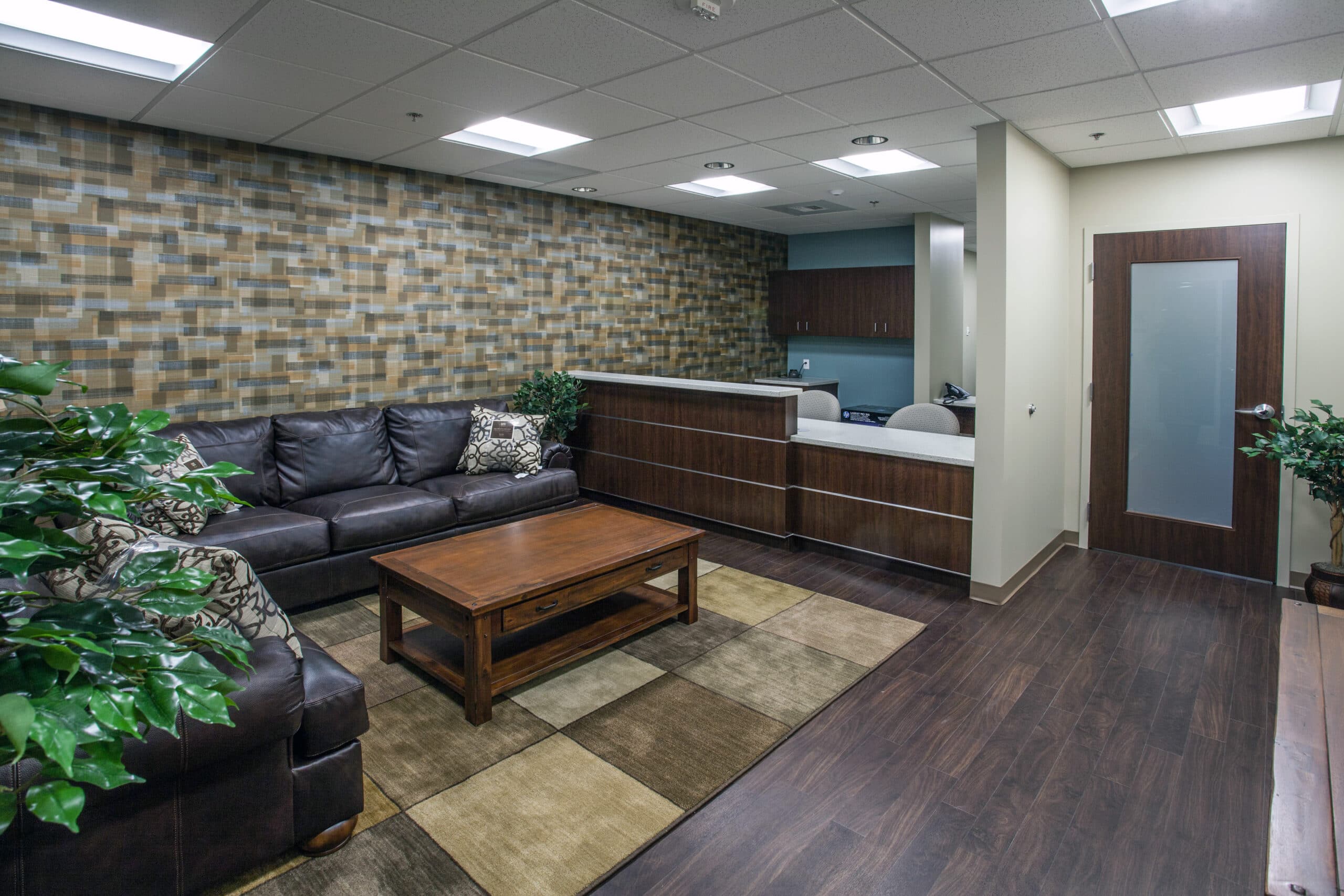 Located on the third floor of the Sharp Chula Vista Campus Cancer Center and Medical Office Building, the Polanco Medical Office Suite includes tenant improvements to 2,100 square feet of medical office space. The upscale offices feature mountain views, a glass mosaic tile wall, and wood-framed frosted glass doors.